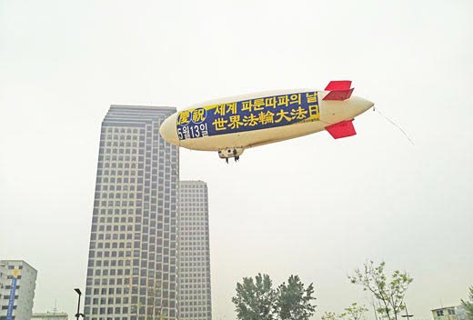 庆祝“世界法轮大法日”的飞船全天飞旋在首尔的汝矣岛-汉江-蚕室之间的上空