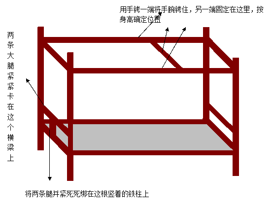 抻床看上去就是一张普通的上下铺的铁床,铁架子都是四方型的,棱角特别硬,硌在大腿骨上特别难受,有的人被抻的时间很长,好几个月都不能正常走路,四肢麻木无力。如上图,手铐铐在手腕上,另一端死死的固定在床架上,腿也被绑着,抻得紧绷绷的,动弹不得,那种滋味特别难受。在抻的过程中,她们隔几分钟就要来敲打我们的胳膊,或用脚踢,那个时候,被手铐铐着的手腕就会剧烈疼痛。有的人一年多了,手腕还是麻木的。