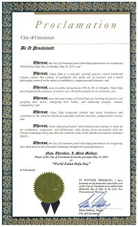 鉴于,辛辛那提市赞赏法轮大法修炼者通过修炼为辛辛那提社区做出的贡献。