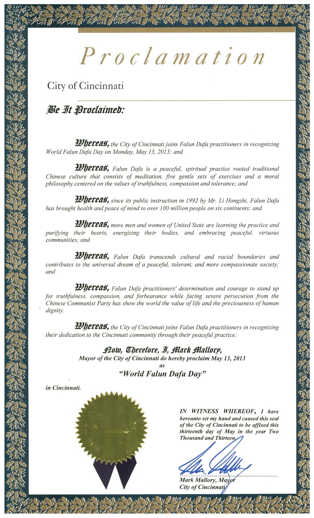 鉴此,我,马克·麦勒瑞(Mark Mallory),辛辛那提市(Cincinnati)市长,特此褒奖二零一三年五月十三日为辛辛那提市