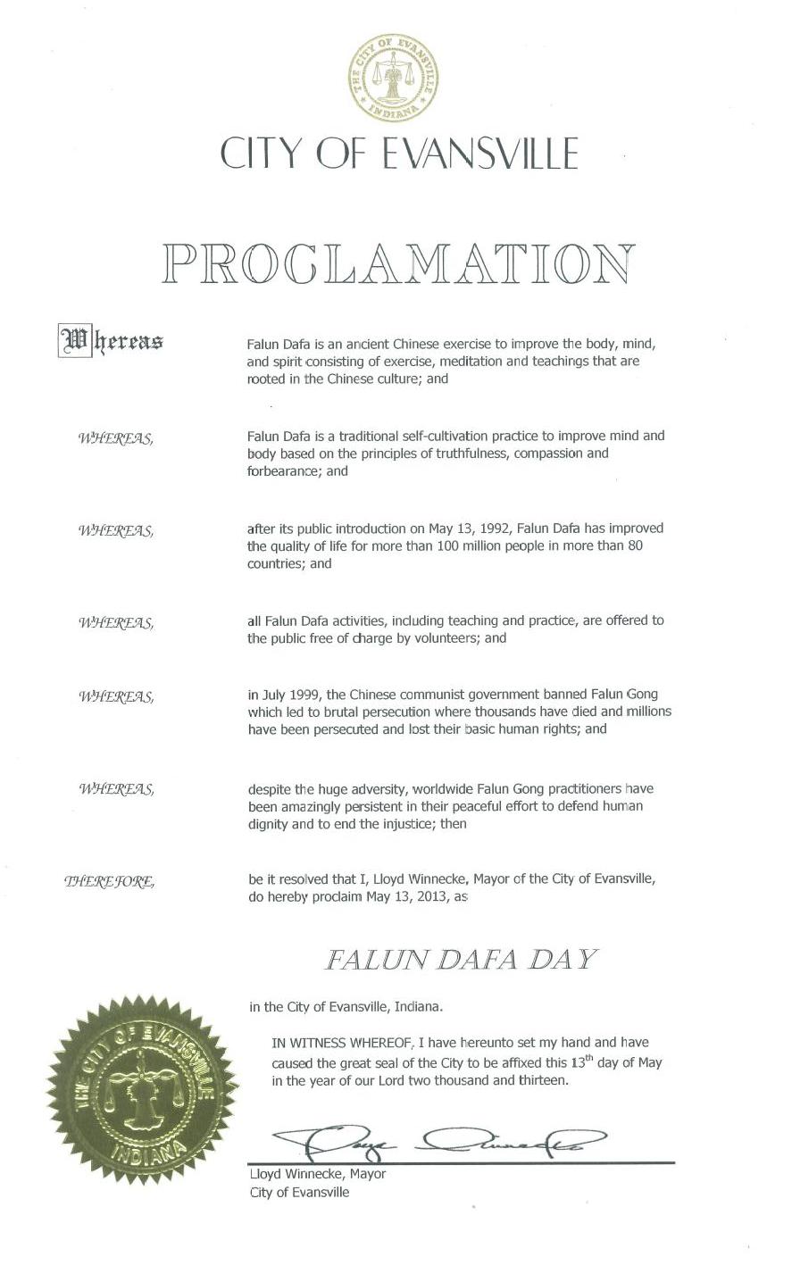 鉴此,我,印第安纳州埃文斯维尔市市长劳埃德·温内克,特此宣告二零一三年五月十三日为印第安纳州埃文斯维尔市