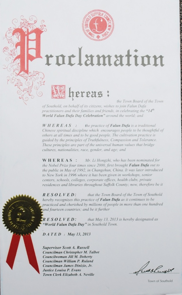 鉴于:法轮大法自一九九六年传入纽约,并在大纽约地区扎下了根。数以百计的修炼者在大纽约地区的老人中心,公司,健身房,私人住家和警察局等地方举办过免费的法轮大法介绍班。尽管中共在一九九九年七月二十日开始禁止法轮大法,法轮大法被世界上一百一十四个国家和地区的人们修炼和珍爱,并获得了三千多份褒奖。李洪志先生自二零零零年起曾四次被提名诺贝尔和平奖,并且主要著作,《转法轮》被翻译成三十八种文字;