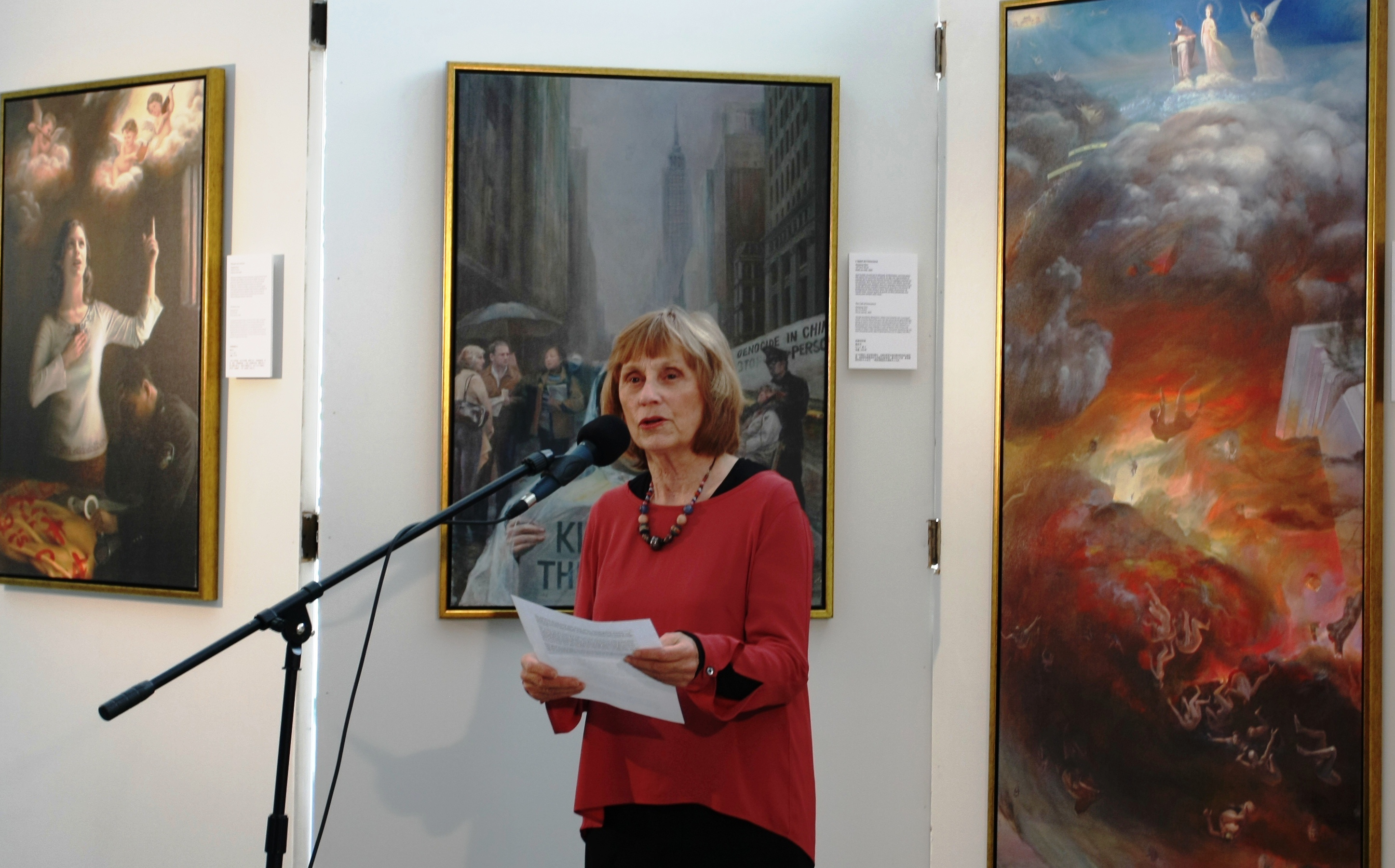 周二的招待会上,美展的画家之一凯西•吉利斯(Kathy Gillis)谈到了国际真善忍美展的创作团队。她说:“我们拥有两个共同点,作为艺术家,拥有绘画技能;作为法轮功学员,我们拥有共同的信仰;……我们的作品并不是抽象派、街头艺术家、学术派画家的大杂烩。我们开始了向内修,作为修炼者、作为艺术家,更新我们自己,我们必须自律……”