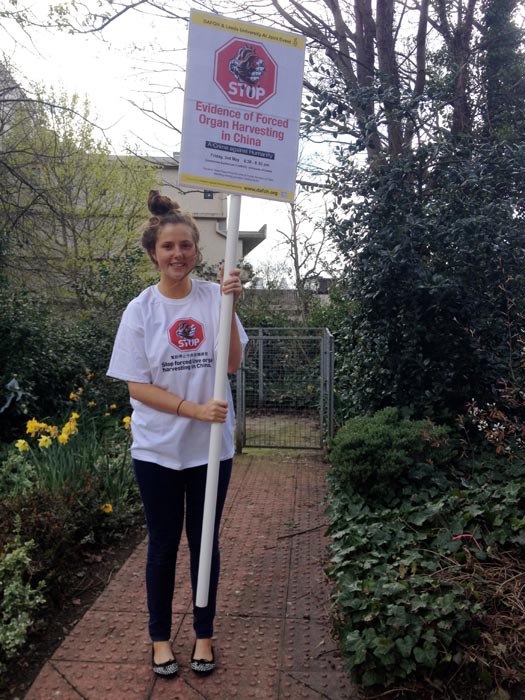利兹大学的学生们看完揭露活摘器官的八分钟录像后,积极参与宣传。有几位学生拿着专门赶制出来的移动展板,穿着反对活摘器官的T恤衫,在利兹大学校园里走动,广而告之的效果很明显。