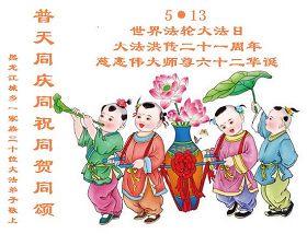 我很高兴的向所有庆祝法轮大法传世二十一周年的人们致以最热烈的问候。