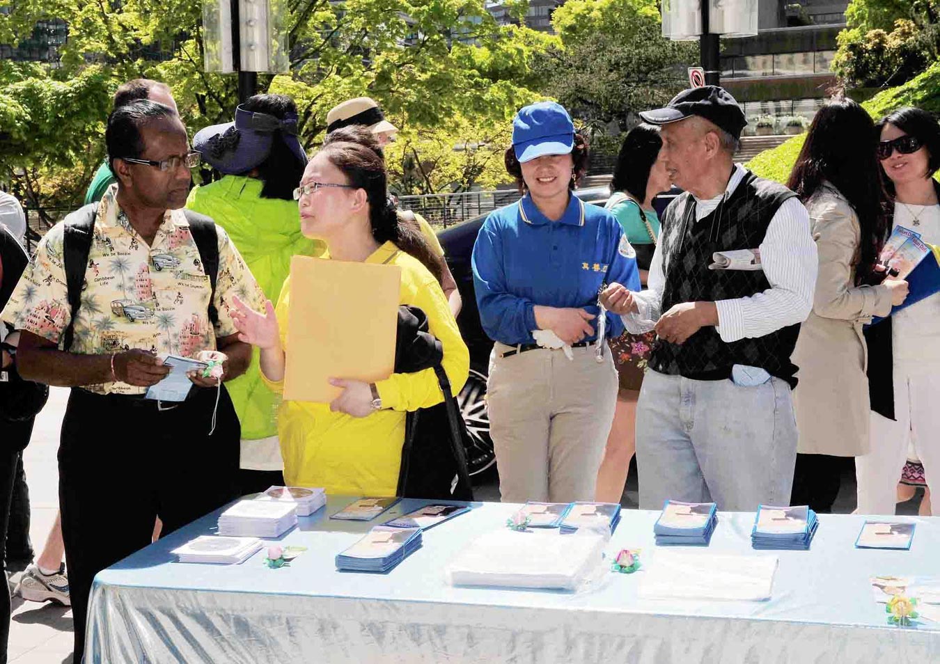 当天温哥华法轮功学员的天国乐团,腰鼓队,和大法小弟子的舞蹈队等分别表演节目,庆祝法轮大法传世二十一年,与世人分享美好和喜悦, 很多来往的行人,驻足观看节目,了解真相, 其中包括很多华人,也纷纷停下来观看,并拍摄活动图片。