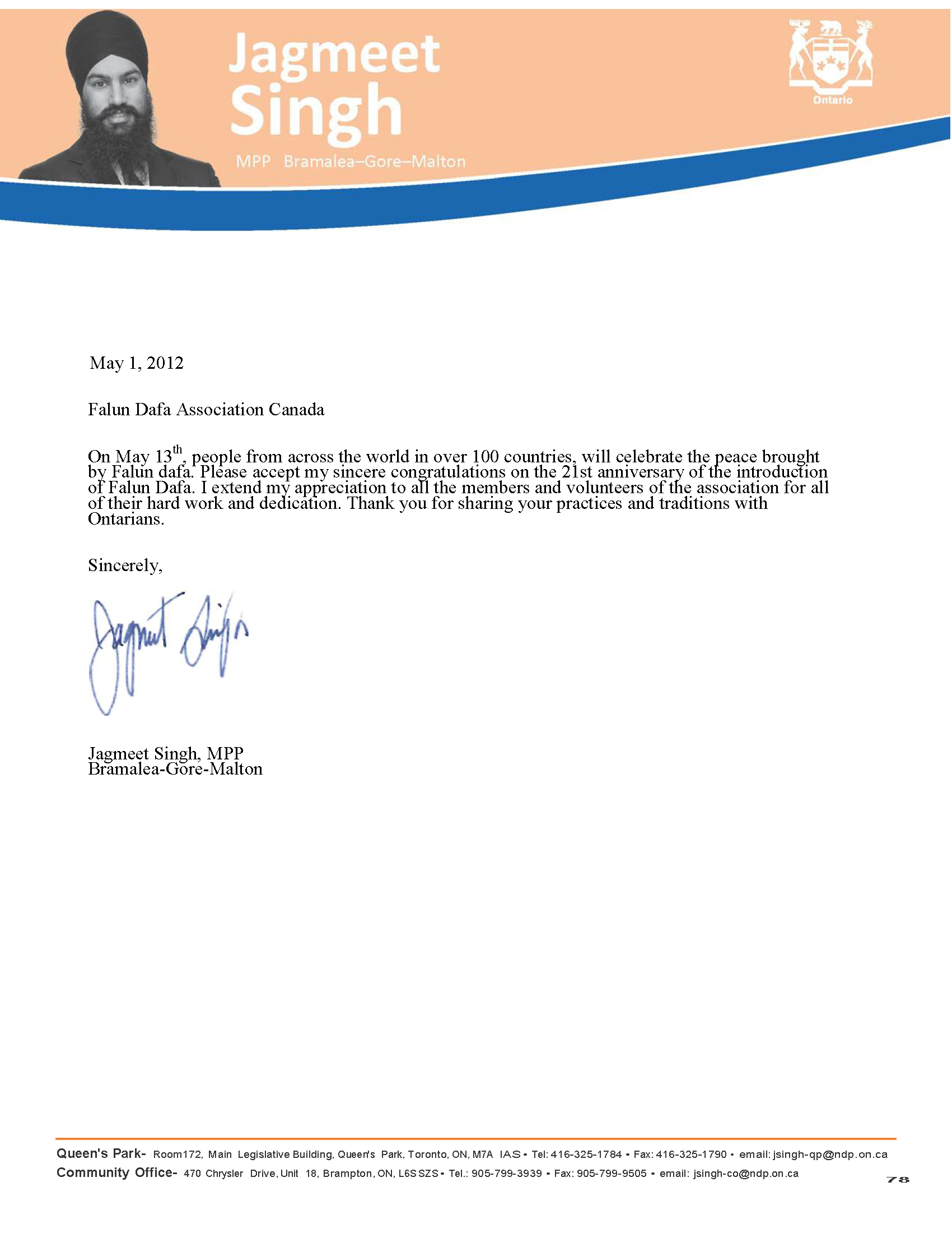 省议员Jagmeet Singh在贺信中感谢法轮功学员的奉献,他说:“加拿大法轮大法协会,在五月十三日,全世界一百多个国家的人们将共庆法轮大法所带来的和平。请接受我对法轮大法传世二十一周年庆典的最诚挚的祝贺。我衷心的感谢法轮大法学员和义工们的辛勤工作和奉献,感谢你们同安省的民众分享你们的功法和传统。”