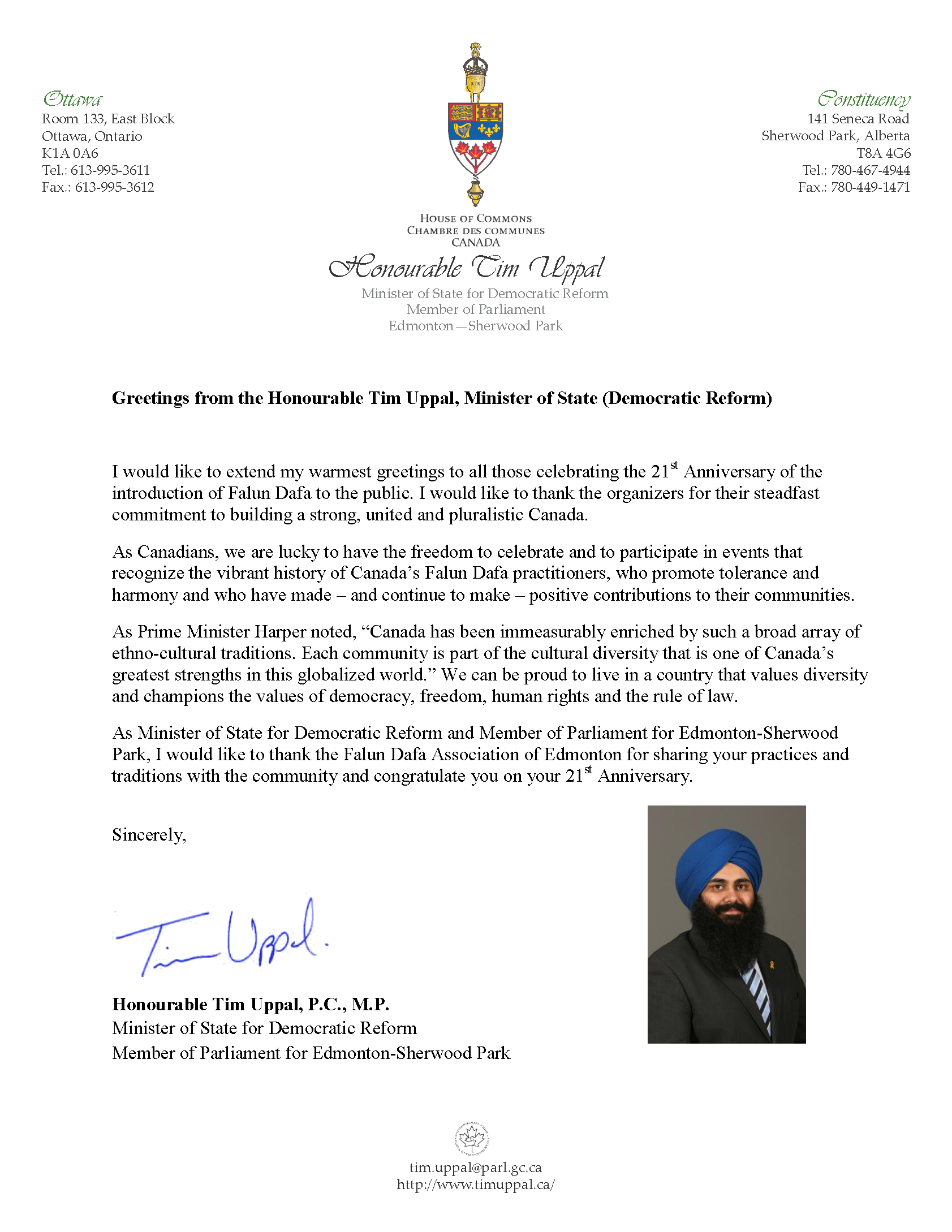 ![]() 加拿大埃德蒙顿国会国会议员蒂姆阿伯尔先生(Tim Uppal)发来的贺信 |