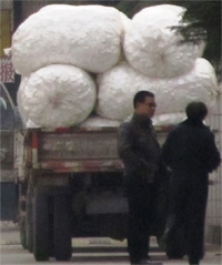 运输原材料的卡车,车号是“鲁VJ2372”,车上拉着成摞的叠好的空袋子和盛满原材料的像化肥袋的白袋子。卡车把原材料拉进昌乐劳教所监区,供被关押者(包括法轮功学员)加工成产品,销往全国各地甚至国外。
