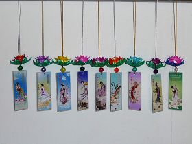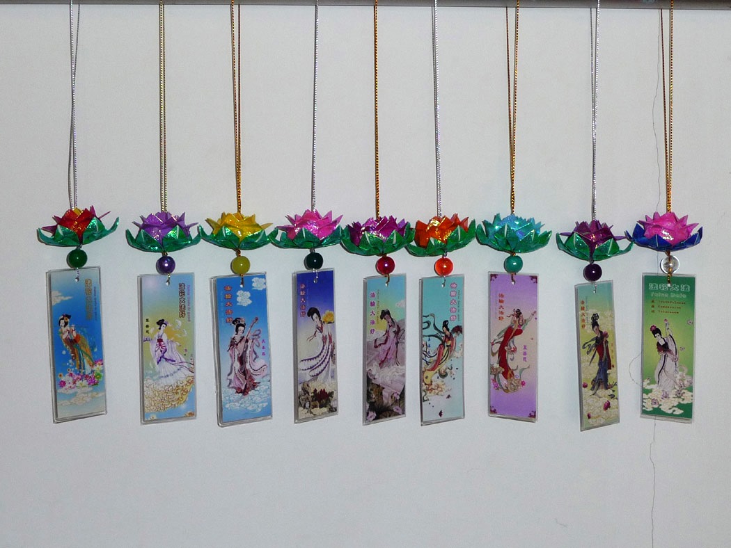 刚开始,我们选明慧网上的各种精美书签制作成莲花底下的吊片。最后考虑到中国人都比较喜欢仙女的形象,于是开始挑选各种仙女图片。真是神奇,晚上同修打坐中,就看到许多仙女排着队,一个一个走过来,好象是等着面试录取。还有的同修看到自己空间上到处是仙女飞舞。很快我们选了十几位仙女的形象,并换上了各种蓝天的背景,每个仙女都脚踩祥云,有的向人间撒花、有的送福、有的手捧仙桃、有的奏着仙乐等等,图片两侧分别写着“法轮大法好”和“真善忍”并配上英文。图片背面是“世界需要真善忍”和各种莲花图案。每个仙女图片都進行塑封,这样图片更加鲜亮也不易变形。