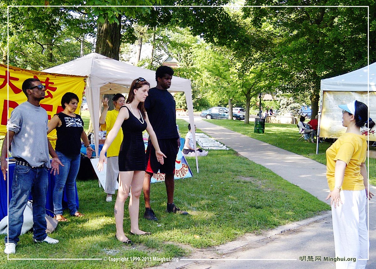 【明慧网二零一三年六月二十六日】(明慧记者荷雨加拿大基奇纳采访报道)“通过这片刻的美妙体验,我感受到无论置身何处,你都可以保有内心的宁静。” 二零一三年六月二十二至二十三日,在加拿大双子城(Kitchener-Waterloo)第四十六届多元文化节上,滑铁卢市政府信息工程师西弥尔(Shimmel)在学炼法轮功时,他微闭双目,将尘世的喧嚣抛在脑外,体味到内心的宁静和玄妙。