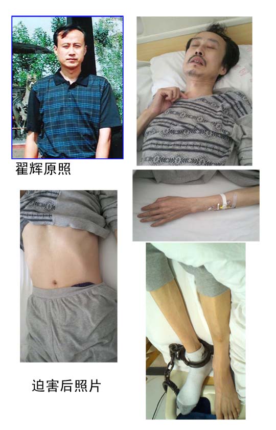 翟晖被迫害得身体极度虚弱,无法行走,坐着身体往下滑,头抬不起来,说话有气无力,发烧,吃就拉,瘦得只剩皮包骨。就是这样身体状况,还被一个大脚镣铐在病床上。