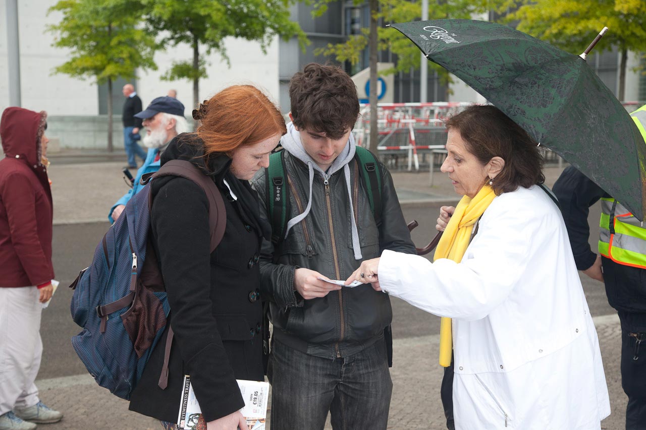 第二天,法轮功学员们来到德国国会大厦旁的德国总理府附近,继续展示停止迫害的诉求。当天仍然阴雨连连,学员们不为所动,向过往行人展示法轮功功法、讲述在中国发生的迫害真相。