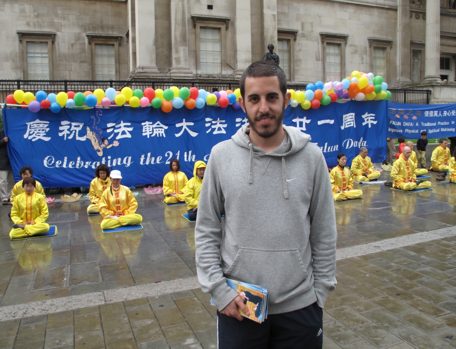 布里斯托市是位于英国西南部一个美丽并有悠久历史的城市,费尔南多是从西班牙萨拉戈萨(Zaragoza)来到这里学习一年历史的学生。半年前,一个看似偶然的机会让他第一次遇到法轮功学员、第一次听说法轮大法。二零一三年五月十一日,他来到伦敦鸽子广场与英国法轮功学员一起庆祝第十四届“世界法轮大法日”。