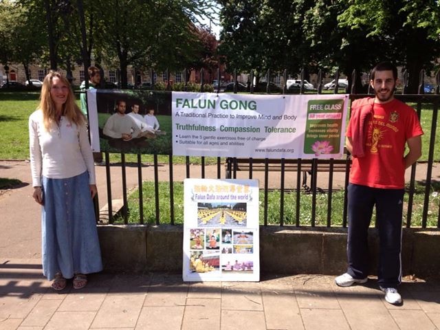 在英国布里斯托刚刚开始修炼法轮功的西班牙青年费尔南多(右)几乎每周都到当地的炼功点炼功和弘法。