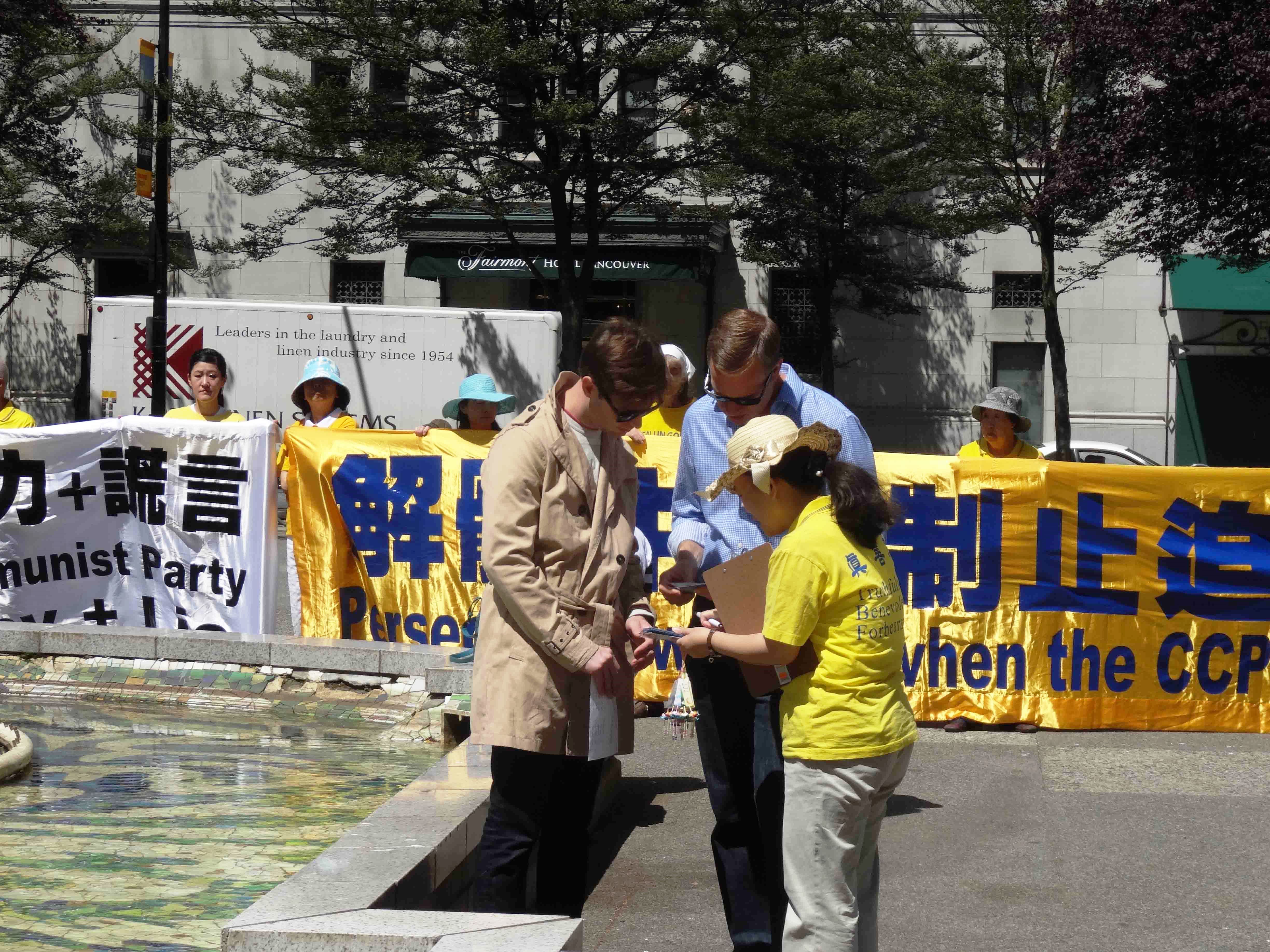 这一天,温哥华天气晴朗,法轮功学员们的集会和天国乐团的演出吸引了很多在市中心经过的行人,纷纷停下来观看集会,了解法轮大法真相,并签名支持停止迫害。有华人留学生当场签名,支持停止迫害法轮功。加拿大价值守护联盟刘先生特意赶到现场发言,表示对法轮功学员坚持和平反迫害的敬意和感谢,并表示邪恶中共本性不可改变必将解体。他说:“三退是对中共的彻底否定,中共政权是人类历史上罕见的残暴而虚伪的政权。”