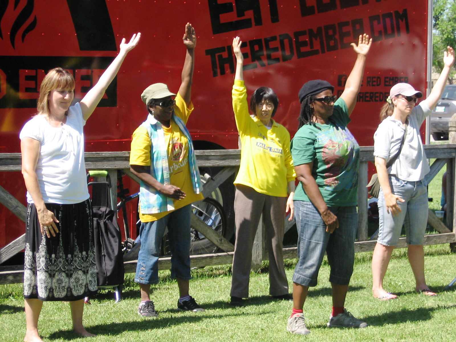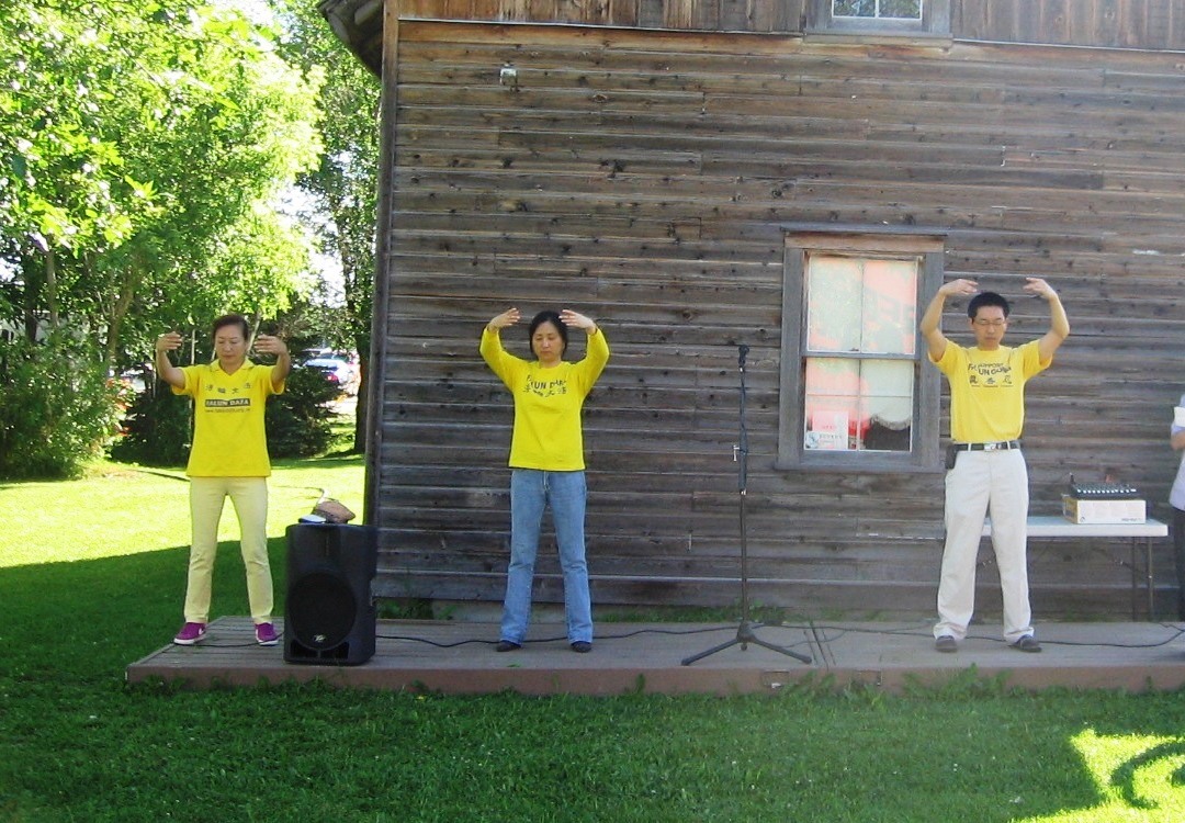 一位本地的妇女领袖,对法轮功的情况已经有些了解,当天她特意过来表示对法轮功支持,并且站在人群中跟大家一起学功。
