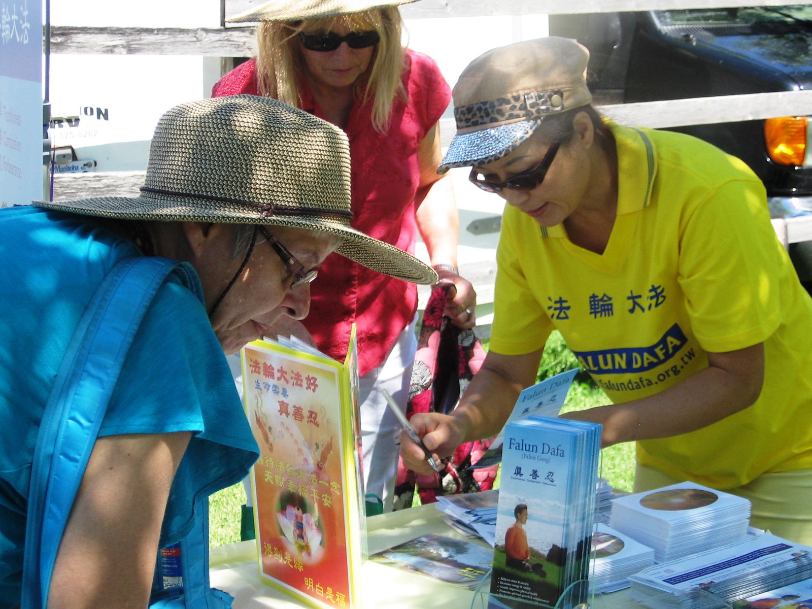 一位在当地经营商店的华人老板,一大早就走到法轮功展位来,饶有兴致地跟学员讨论起来。他在国内有一个很好的朋友也是炼法轮功的,他听说过法轮功被迫害的事情,知道修炼法轮功的都是好人,但是他对共产党制造的党文化还认识不清。经过跟法轮功学员的深入探讨,他对中共的邪恶本质有了更清醒的认识,并现场声明退出中共相关组织。