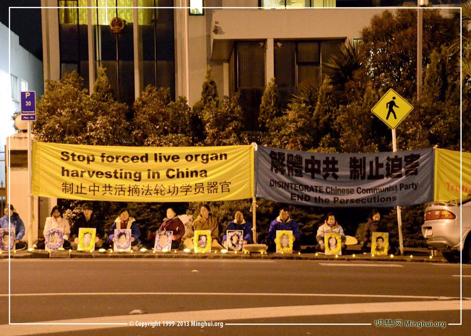 【明慧网二零一三年七月二十日】二零一三年七月十九日晚,新西兰奥克兰法轮功学员来到Great South路的中领馆前,以烛光悼念的方式缅怀被中共迫害致死的中国大陆同修,同时抗议中共对法轮功长达十四年的残酷迫害。