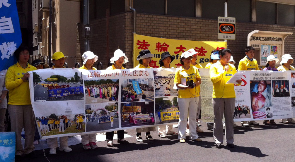 学员们打出了“法轮大法好”、“法轮大法是正法”、“退党自救”等中日文横幅,然后开始集体炼功和发正念,并用中文和日文宣读了题为“解体中共,停止迫害”的公开信。自一九九九年迫害发生以来,关西地区法轮功学员坚持以和平理性的方式,抗议中共惨无人道的迫害,向民众讲清法轮功真相,共同制止暴行。
