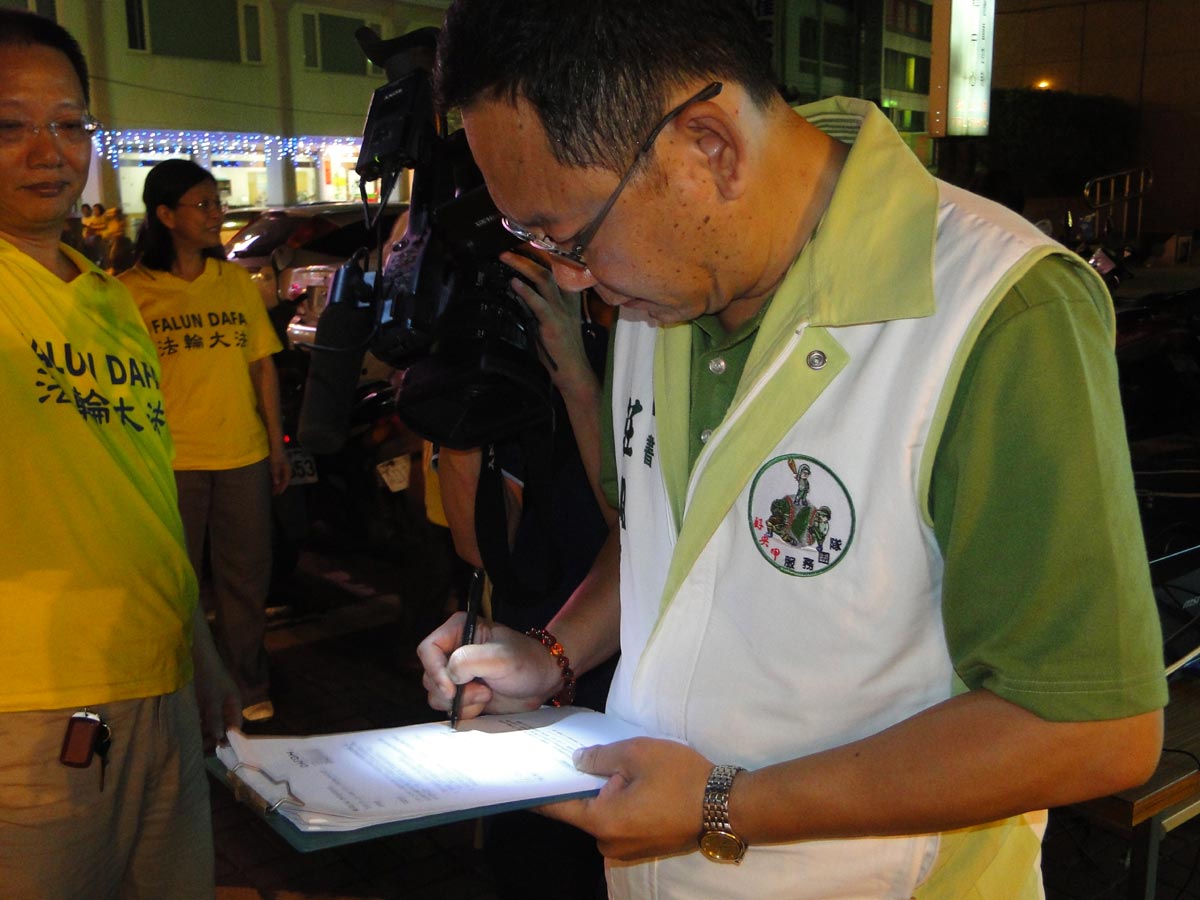 立法委员刘建国从几年前得知法轮功学员被迫害真相之后,年年站出来支持反迫害,在行程满满之际,他将其它行程延后,专程从北港赶回来斗六,亲身莅临现场并当场签署制止活摘法轮功学员器官的连署书。他对法轮功学员的努力与付出表示敬意,席地而坐与法轮功学员并肩悼念默哀。他说,一直以来和大家共同努力制止中共对法轮功学员的迫害,这需要念力、毅力,在台湾他看到了这样的曙光,未来还是一样跟大家站在一起,并持续下去。