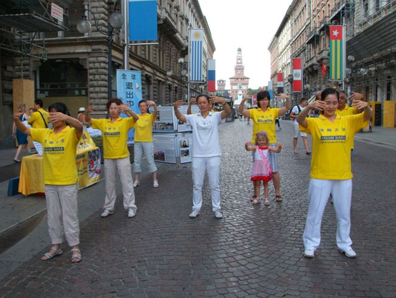 二零一三年七月二十日,意大利法轮功学员在米兰市中心集会,揭露中共的迫害。很多游客都主动上前了解详情,签名反对中共活摘法轮功学员器官的罪行。