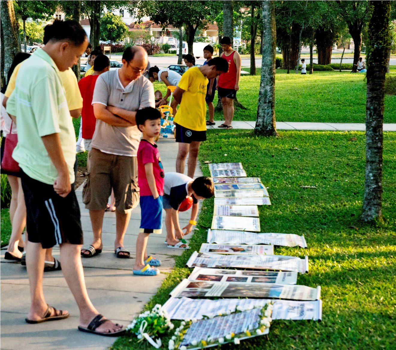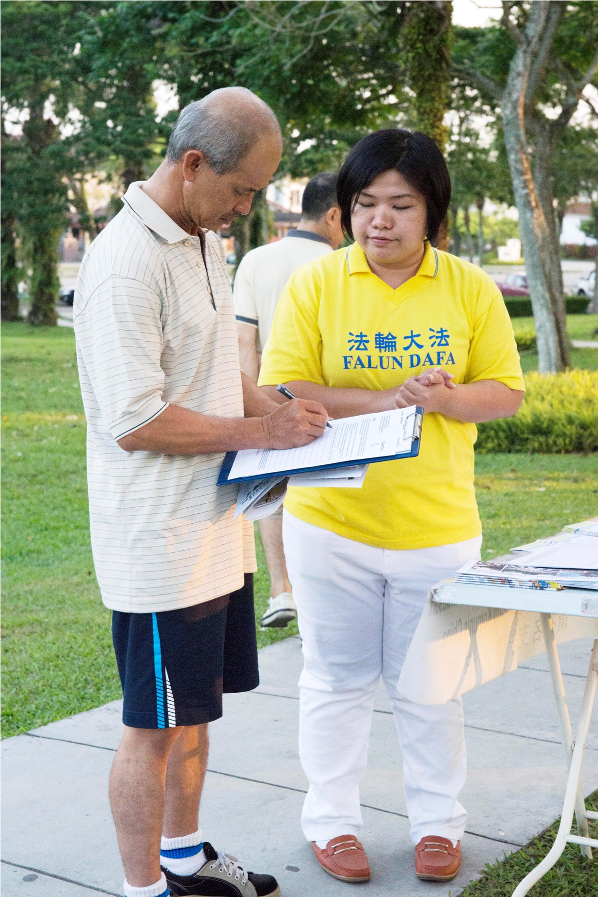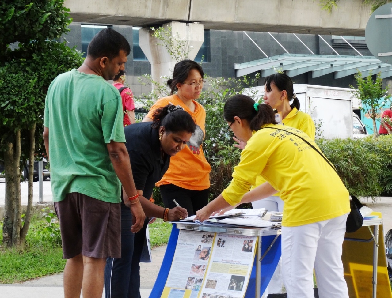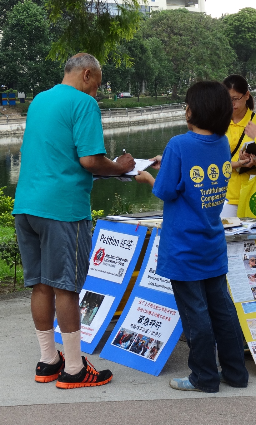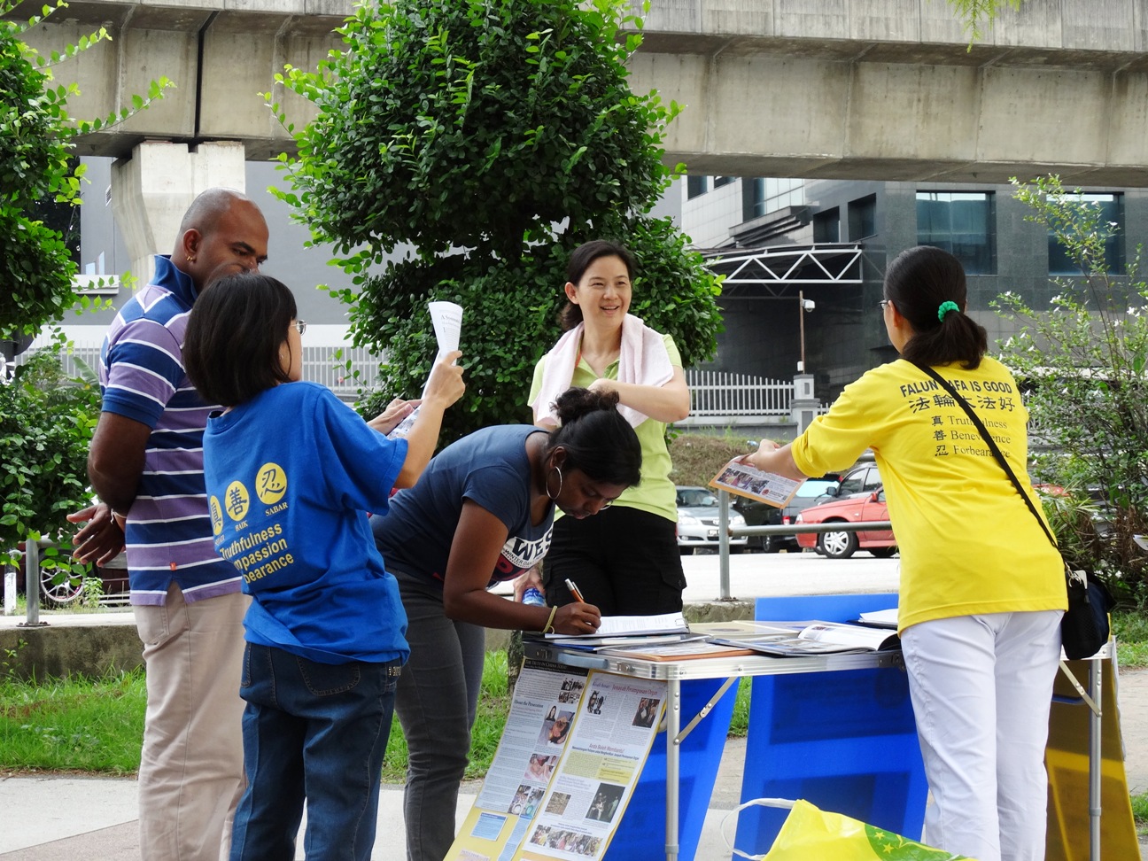 法轮功学员长期坚持的向民众讲真相,使越来越多明白了真相的人站出来,声援和支持法轮功学员。在八打灵再也公园悼念会上,法轮功学员持续向民众征集签名,制止中共活摘法轮功学员器官,民众纷纷谴责中共的恶行。