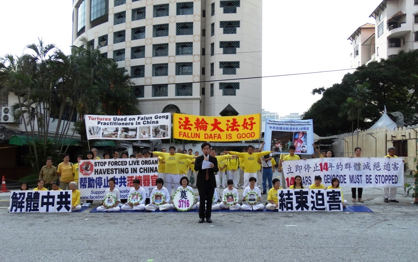 法轮功学员代表在集会上再次宣读七.二零文告,郑重宣布,将把目前收集到的“制止中共活摘法轮功学员器官”征签递交给大马卫生部,把中共罪行进一步曝光:“法轮功学员将会递交此征签给我国的卫生部,让我国政府正视中共的反人类罪行。”