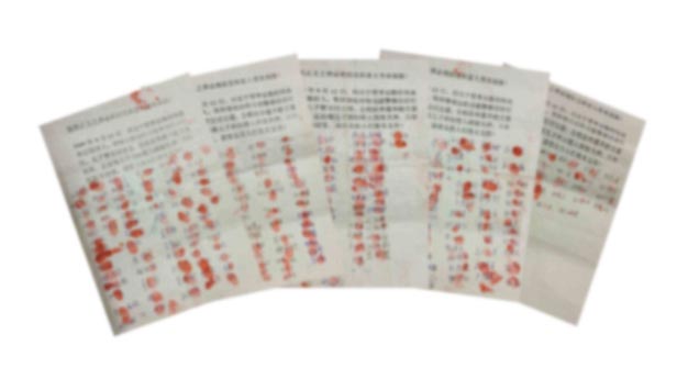 二零一二年二月二十五日,河北省沧州泊头市公安局强行绑架了周官屯村的村民、法轮功学员王晓东,不顾王晓东八旬老母的苦苦相劝,不顾王晓东七岁孩子的惊恐啼哭。这个村的村民每家出一个代表签名并按下红手印来担保,村委会还郑重地加盖了村委会的大红章,证明王晓东的人品,呼吁释放王晓东。“三百手印”辗转送进中南海,引起国内外震惊。