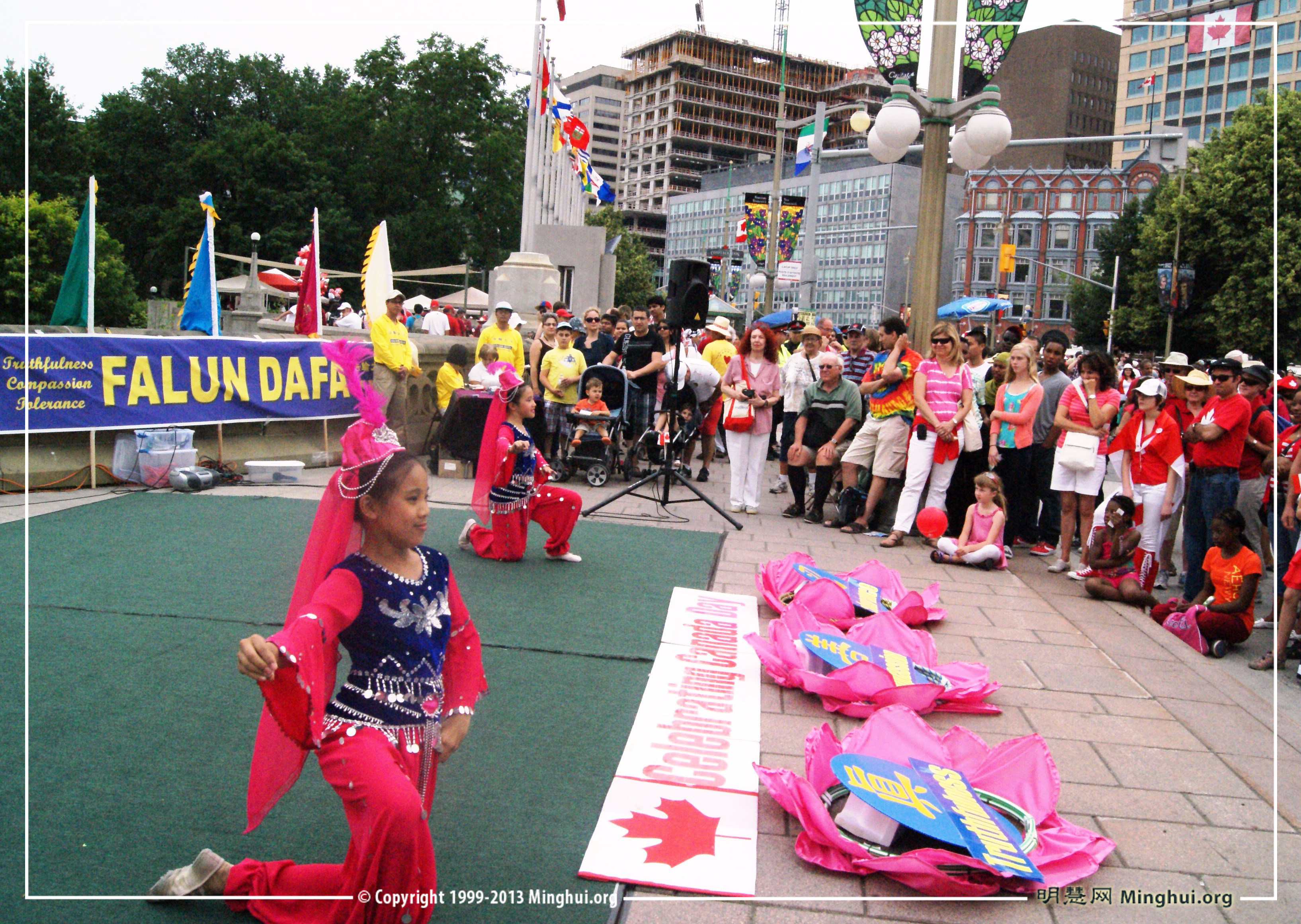 法轮功学员从二零零零年开始,每年国庆节都参与渥太华国会山前的庆祝活动,传播法轮大法“真、善、忍”的福音。二零零二年开始,他们为加拿大人带来了文艺演出,功法演示、舞蹈(中国古典舞、民族舞、民间舞)表演、舞狮和天国乐团的演出无不受到大量观众的热烈欢迎。