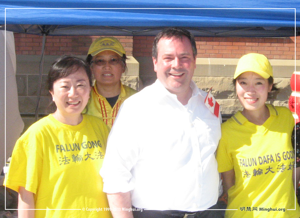 ![]() 图8:卡尔加里国庆日,加拿大移民部长杰森•肯尼(中)与法轮功学员合影 |