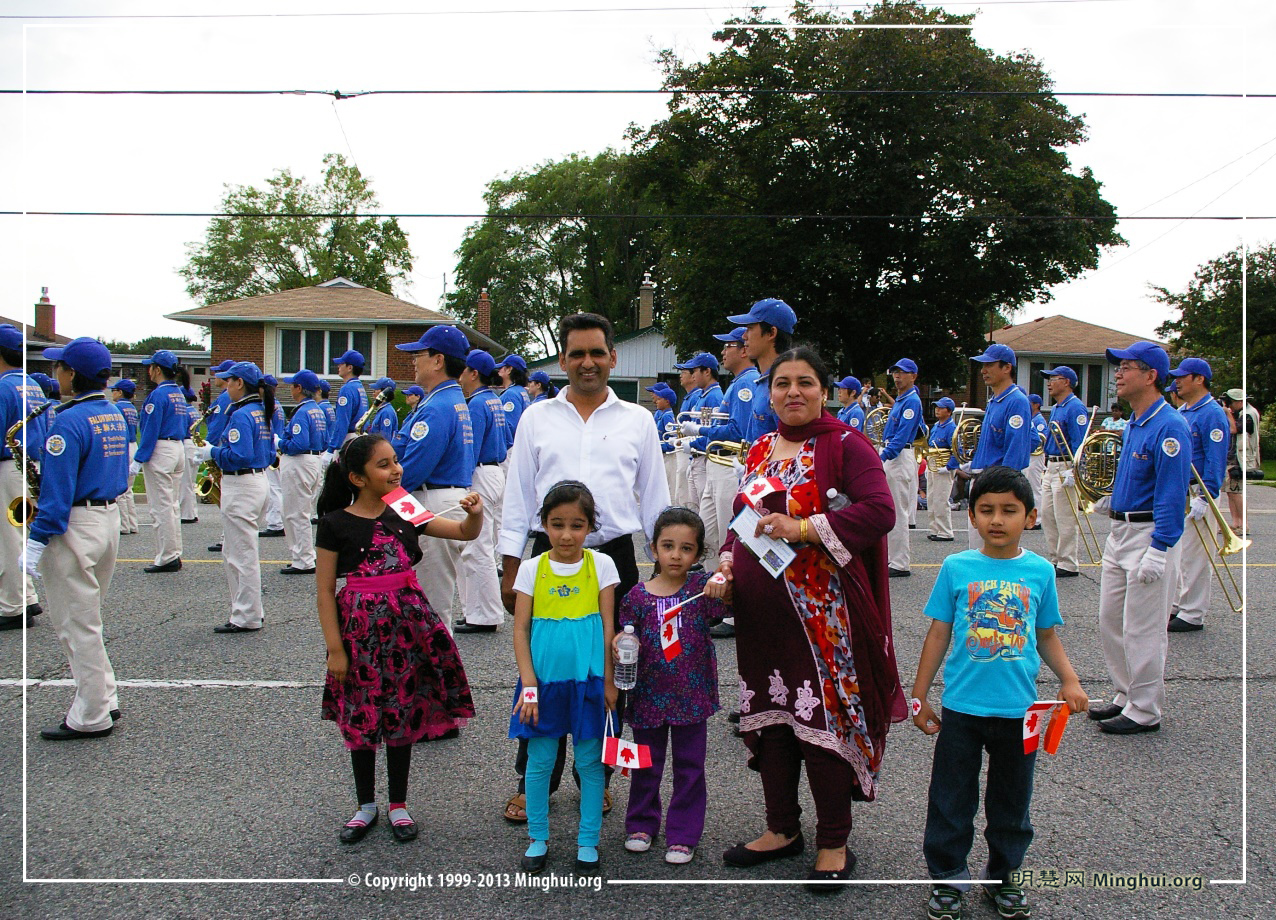 今年的国庆节,多伦多法轮功学员组成的天国乐团参加了两个游行:尼亚加拉瀑布(Niagara falls)国庆游行(上午11点)和大多伦多士嘉堡市(Scarborough)国庆游行(下午4点)。主办方表示:“我们这里的每个人都很喜欢他们(everyone love them!)。”西人观众感谢:给我们带来这么美好的演奏;华人观众感叹:法轮功是在全世界受欢迎的团体,中国不该迫害