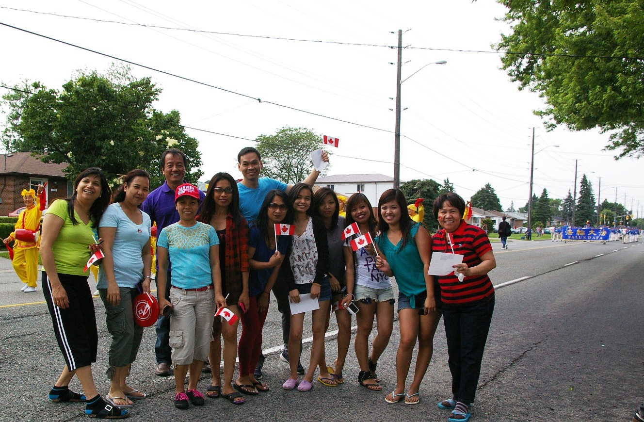 士嘉堡市是大多伦多地区华人最集中的一个区。这天很多华人看到法轮功的队伍都很高兴,并纷纷录像并合照。