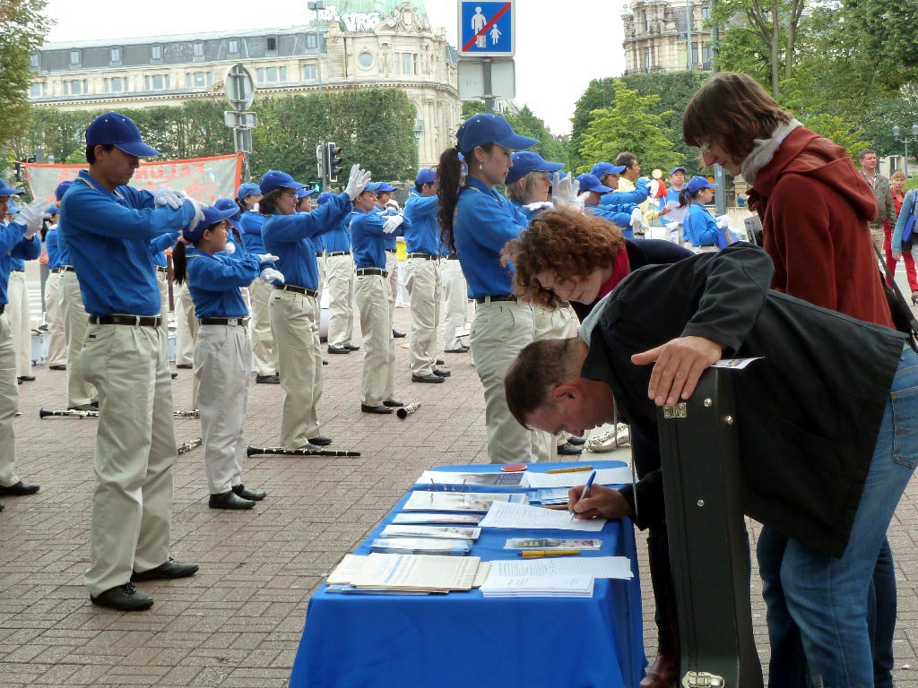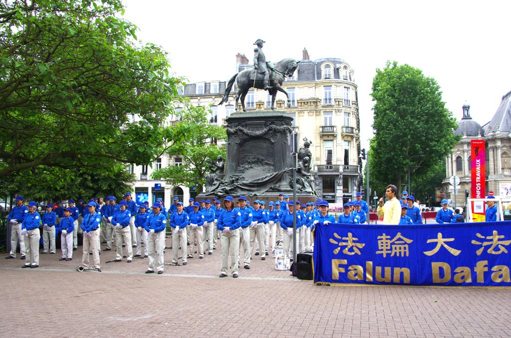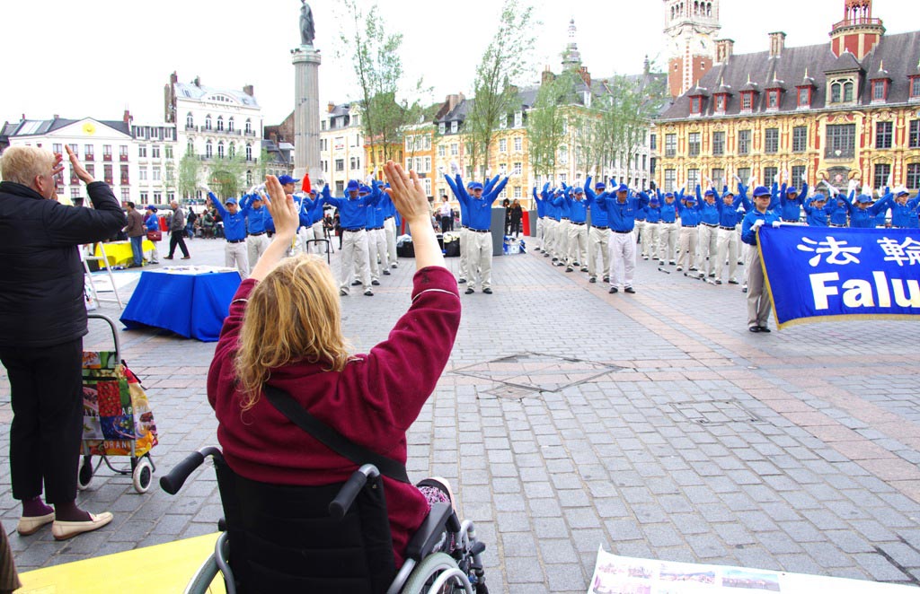 演奏后,乐团队员伴随着炼功音乐,整齐地向观众们展示法轮功功法,每一套功法之间都有一位法国学员介绍功法特点,并告诉观众发生在中国的迫害以及中共活摘法轮功学员器官的罪恶。