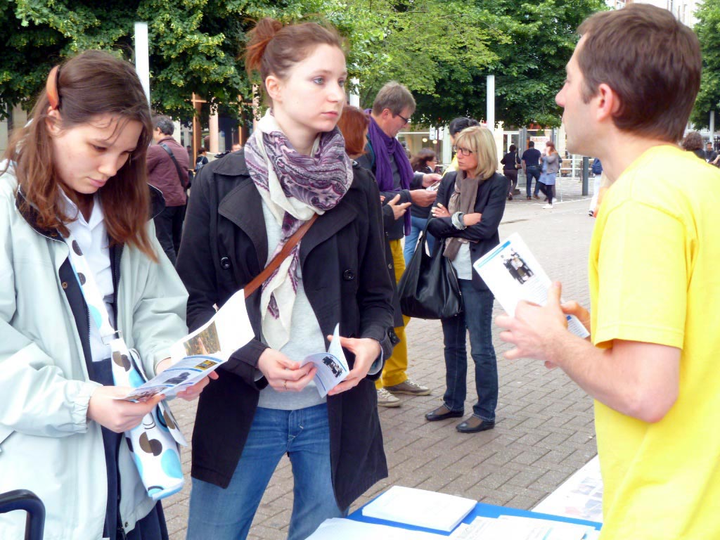 活动持续了四个小时,期间很多从中国大陆来的学生三五成群过来观看、照相。他们很多是刚出国不久的,看到如此多的法轮功修炼人的队伍很惊奇,有人还大声喊“法轮大法”。通过和法轮功学员的交谈,他们了解了三退(退出中共党、团、队)的意义。法轮功学员也善意地告诉他们,记住“法轮大法好、真善忍”这九个字,对你的生命有着特别的意义。学生们高兴地点着头,接受了《我们告诉未来》光盘等法轮功真相资料,以及《九评共产党》。他们表示一定回去好好了解法轮功。