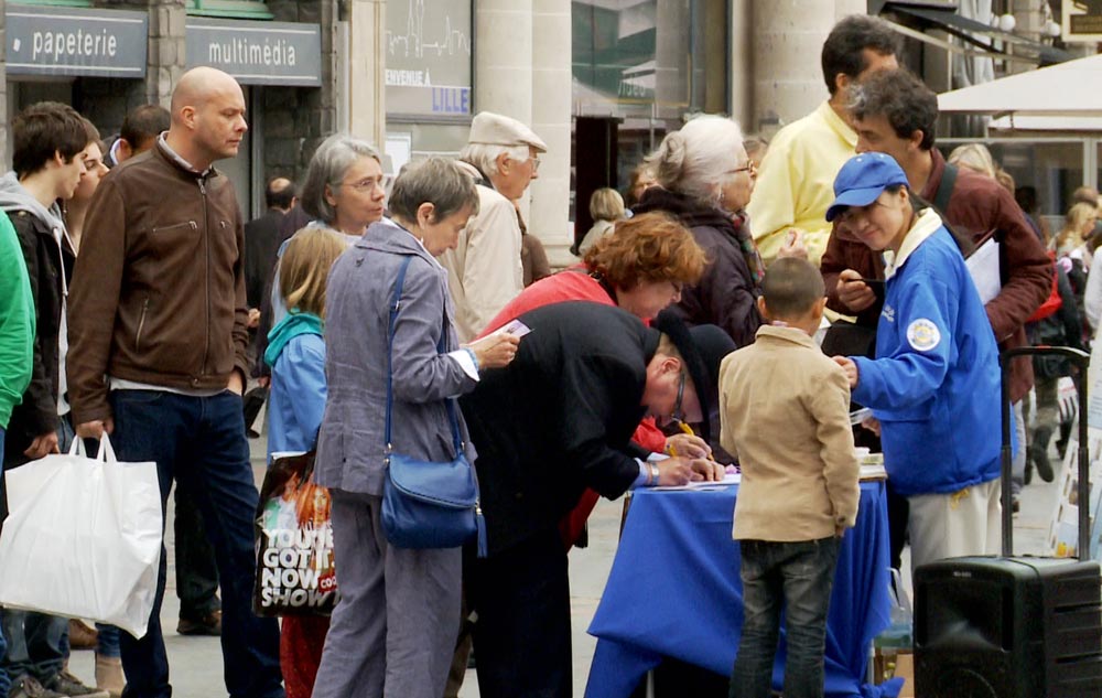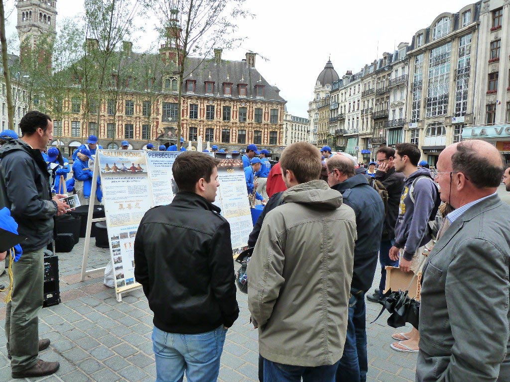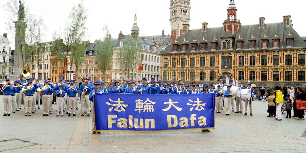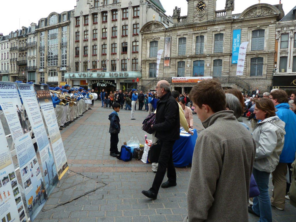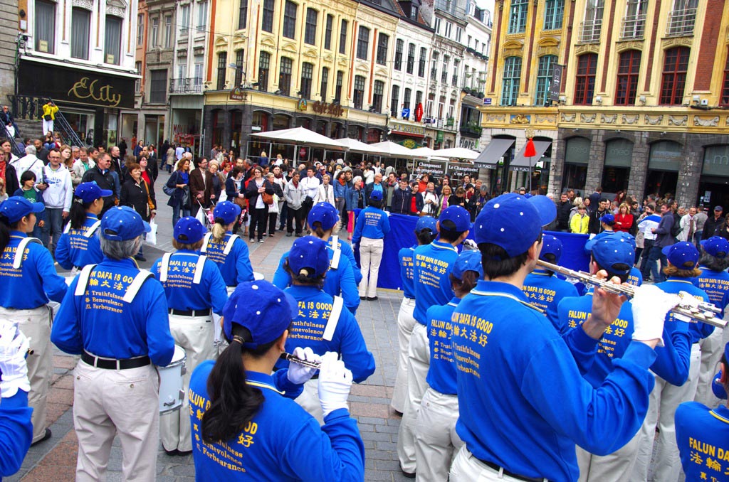 下午,天国乐团来到繁华的戴高乐广场(place General de Gaulle),头戴蓝色帽,身穿“法轮大法好”T恤白裤的乐团一出现,马上引起在广场休闲人群的兴趣,他们自动地形成以乐团为中心的一百八十度的看场。围观人群始终保持在上百人。