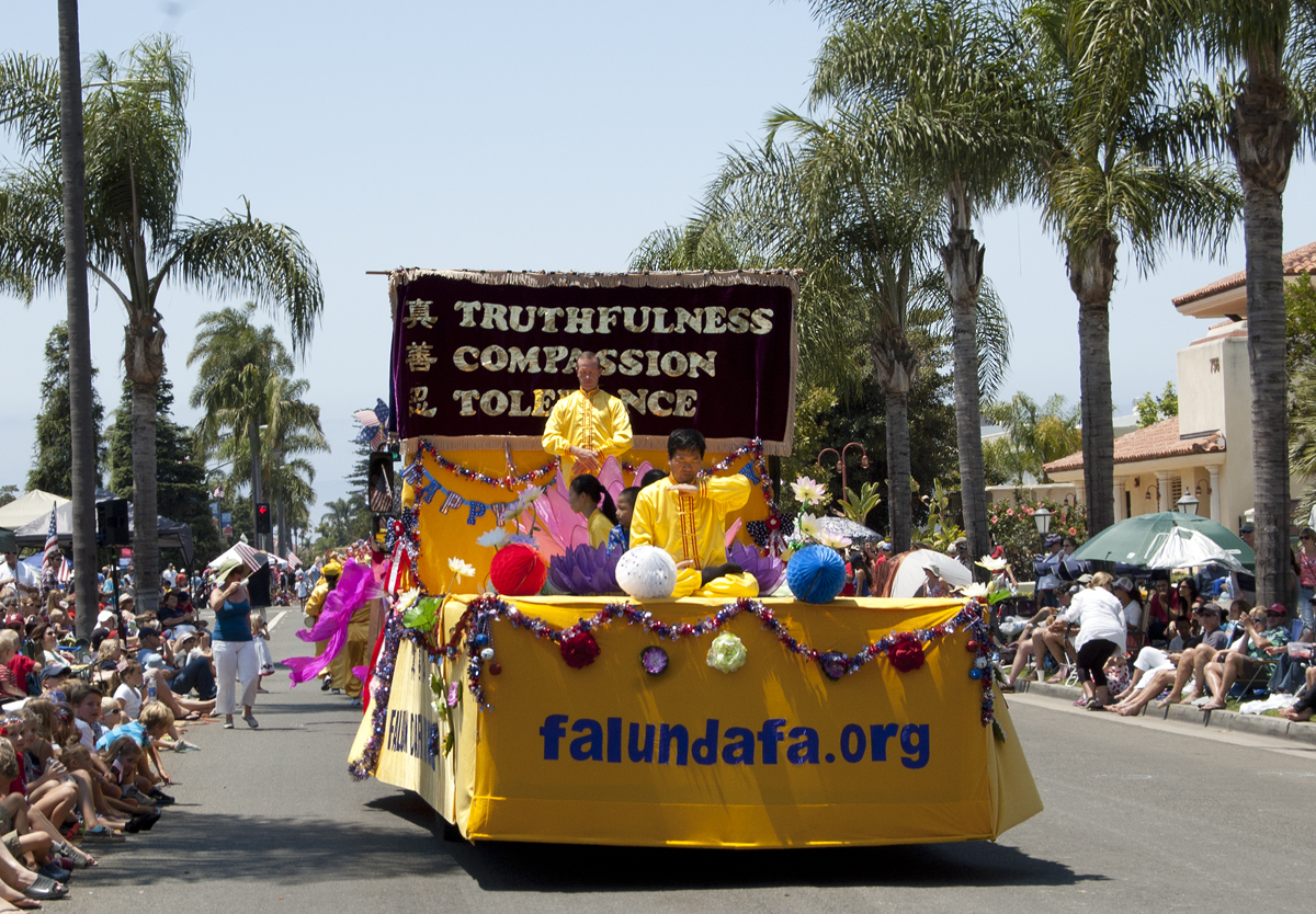 七月四日,加州圣地亚哥法轮功学员应邀参加了当地规模最大的科罗纳多岛(Coronado)的国庆游行,法轮功学员自二零零四年开始,应邀参加科罗纳多岛的国庆游行后,深得组织者信赖和民众好评,每年组织者都邀请法轮功参加。今年法轮功的队伍包括装饰着莲花和国旗色彩花饰的花车、腰鼓队、和仙女队。花车顶端悬挂着两块紫色丝绒布的横幅,一面绣着“法轮大法”中英文金色大字,另一块上绣着“真善忍”中英文金色大字,庄严神圣。花车上,学员们展示着五套功法,花车四周和花车上装饰着莲花和亮丽的国庆饰物,充满平和、善、和喜庆,因此获得本年度游行花车组第二名。