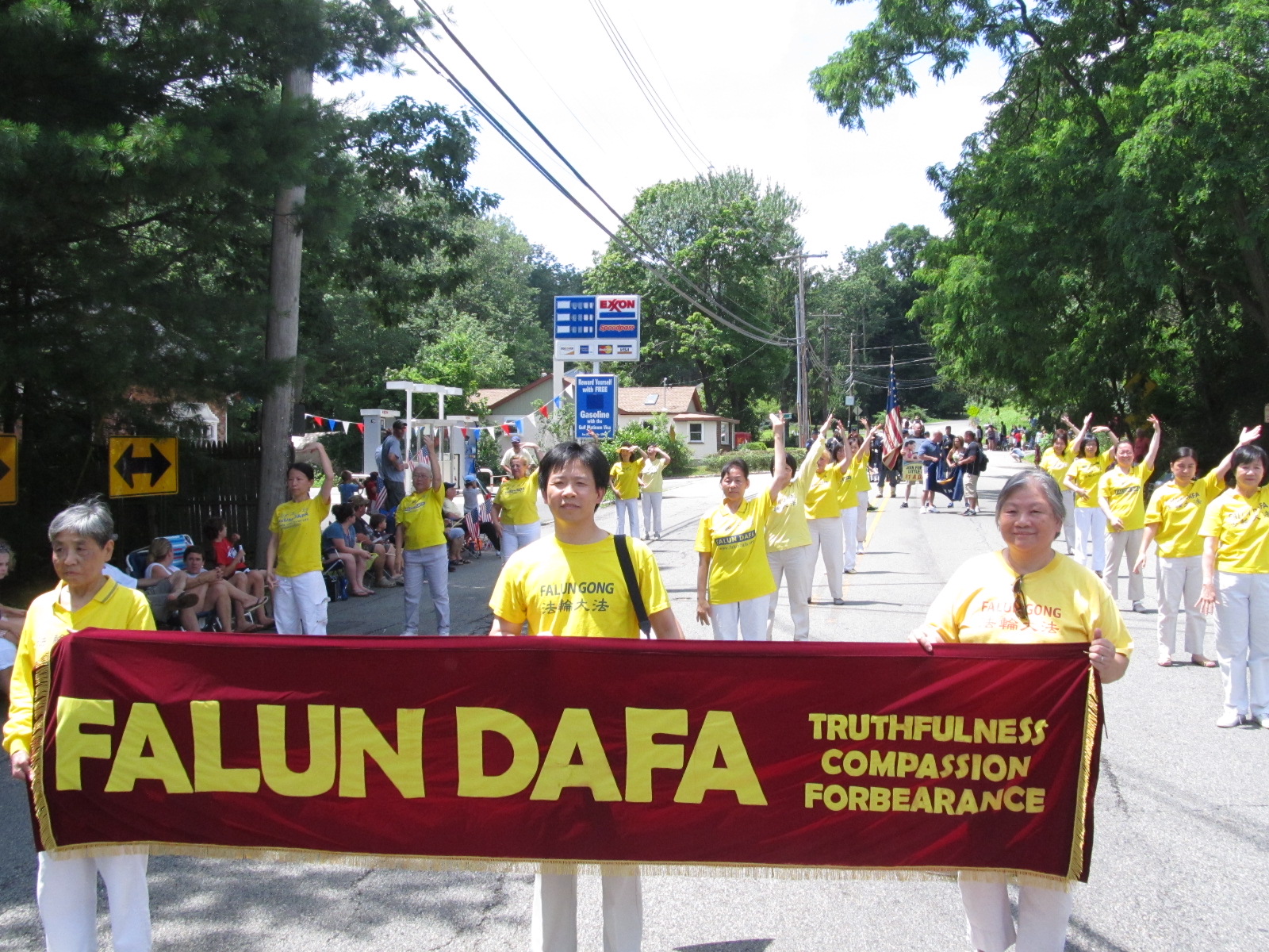 由新泽西州部份法轮功学员参加的游行队伍是唯一的以亚裔为主的队伍。他们由舞狮和锣鼓开道,再加上祥和的法轮功五套功法表演,法轮功队伍所到之处观众热烈鼓掌并纷纷接过传单,希望能了解更多有关法轮功的信息。尽管游行当天天气炎热,法轮功学员的游行队伍一直不停地进行平和的功法表演,为观众再次留下了美好印象。