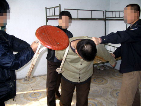 ![]() 中共黑狱酷刑演示:铁桶敲头 |
