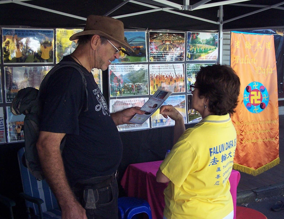 【明慧网二零一三年八月二十日】(明慧记者陈心宁澳洲报道)连续十年参加昆士兰阳光海岸(Sunshine Coast)杨迪纳街坊节(Yandina Street Fair)的法轮功学员们,二零一三年八月十八日再度将弘传世界的神奇功法介绍给澳洲当地的民众。看到这么美好的功法,又了解到发生在中国的迫害,许多人不解地问:祥和的功法与真、善、忍理念哪里错了?中共为何迫害法轮功?