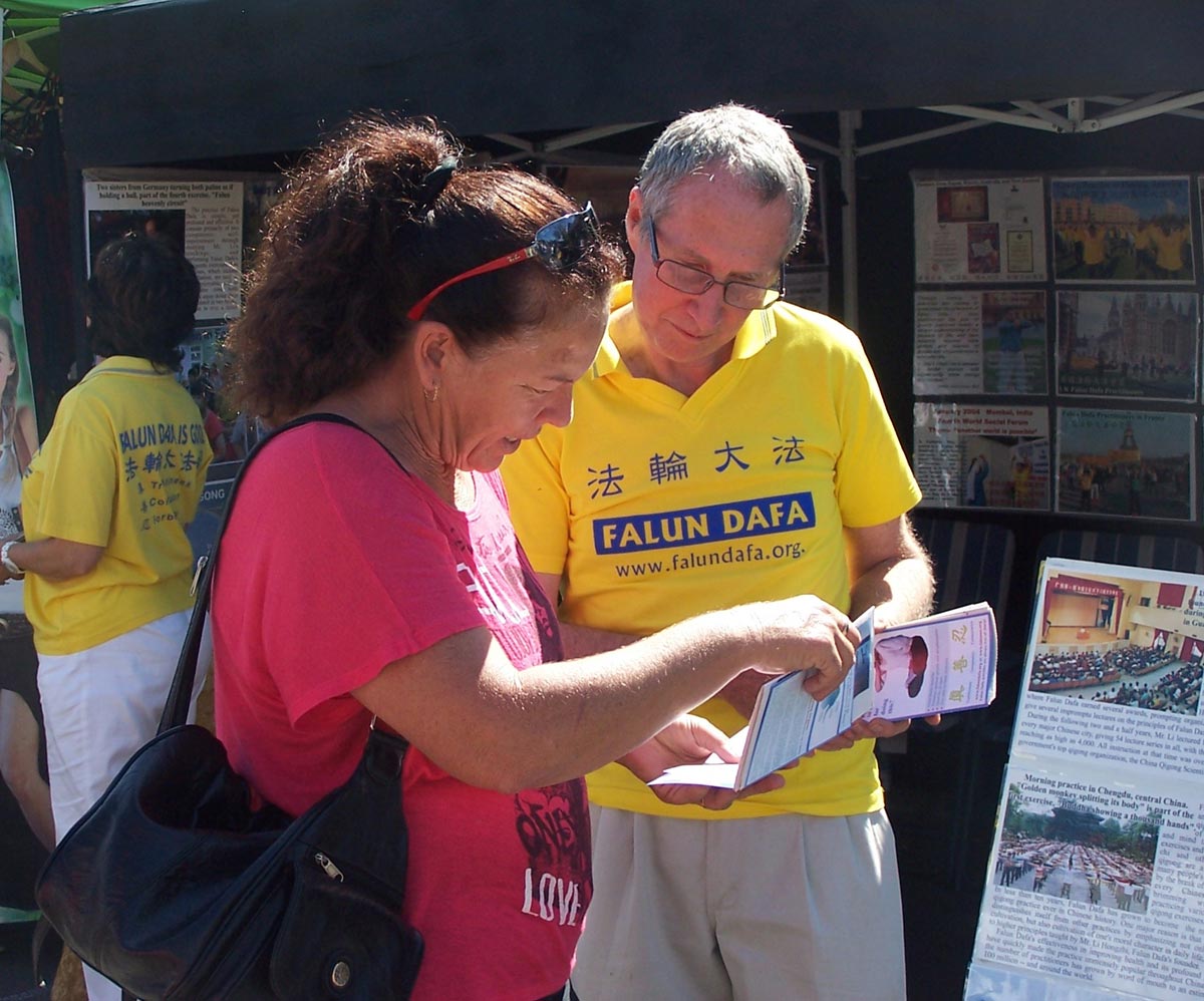 一名来自德国的男子被法轮功展位上的照片所吸引,他很高兴得知法轮功弘传全世界,包括他的家乡德国。他对宇宙能量很感兴趣,学员推荐他阅读法轮功的书籍,进一步了解功法及内涵。了解了法轮功在中国遭受迫害的详情后,这名男子对法轮功表示非常支持。