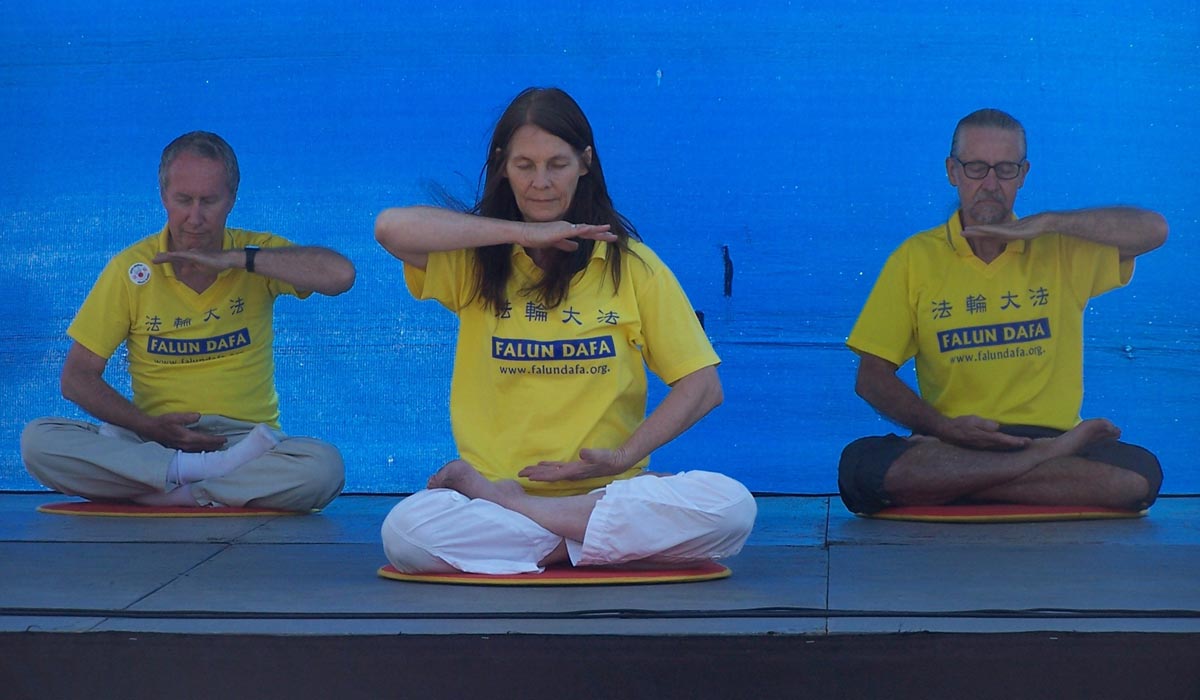 法轮功学员在阳光海岸杨迪纳街坊节的舞台上展示法轮功功法