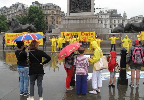 二零一三年八月二十四日下午,英国法轮功学员冒雨在伦敦鸽子广场中心演示法轮功功法,传播真相。