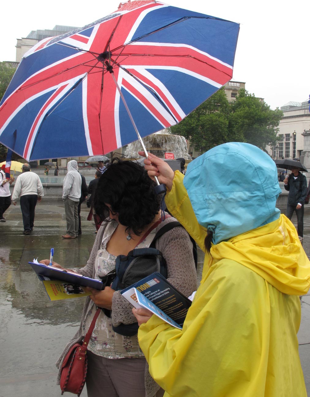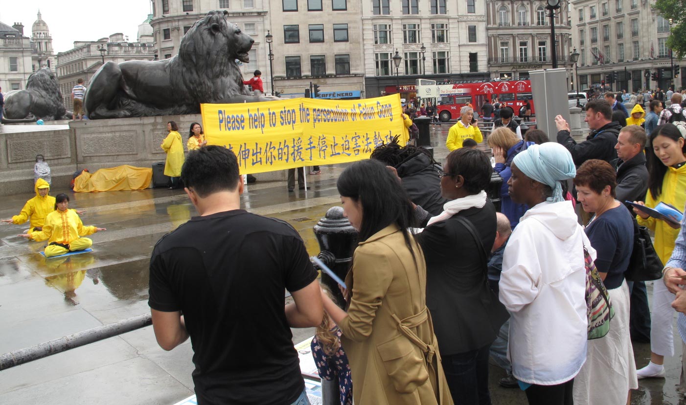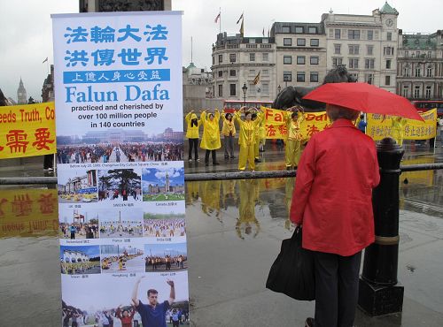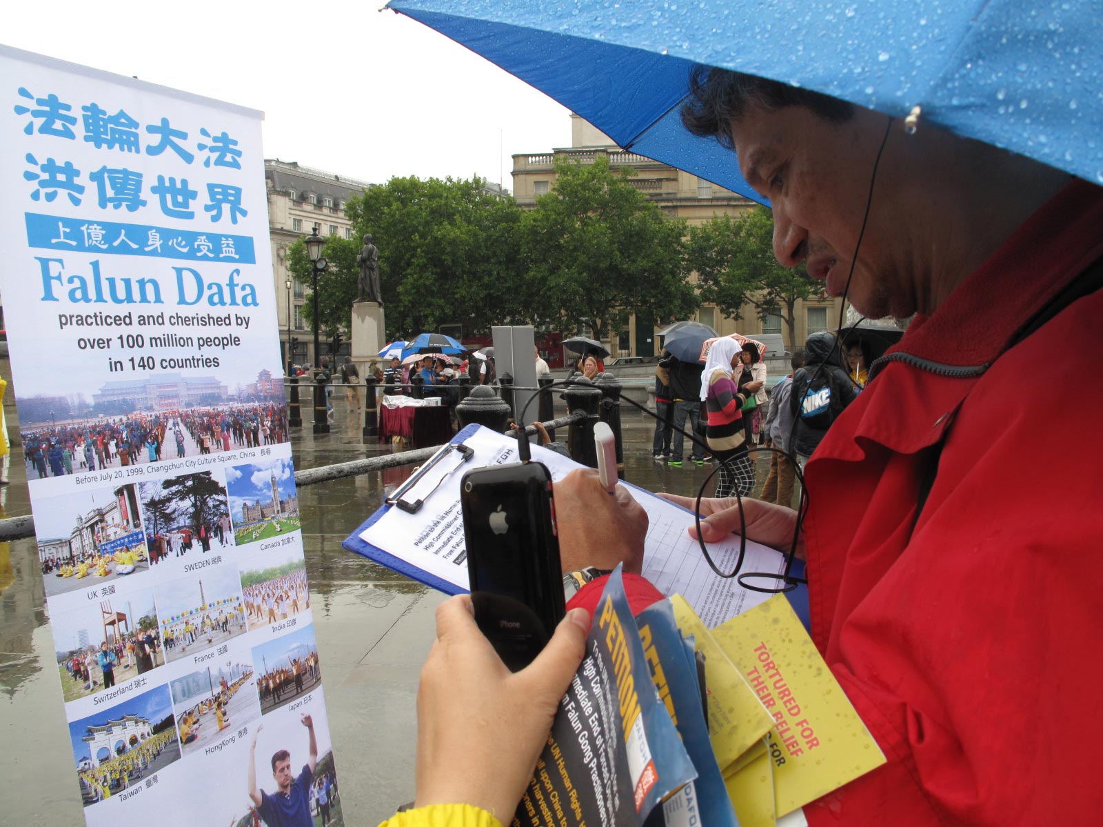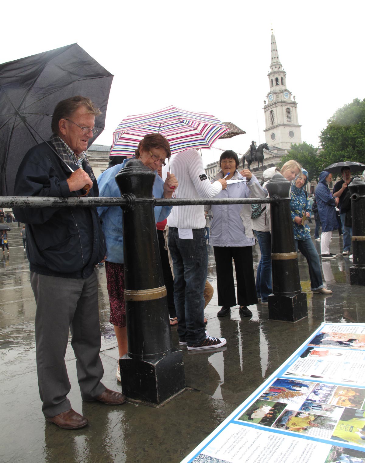 法轮功真相的呈现,特别是中共活摘法轮功学员器官罪恶的曝光,让鸽子广场上、来自世界各地的游客们深受震撼。尽管当天活动碰上了伦敦的下雨天气,有时雨下的很大,但参加活动的法轮功学员不为所动,把鸽子广场变成以风雨做幕、传播法轮功真相、揭露中共邪党罪行的舞台。面对法轮功真相,人们在思考、在选择,了解真相的人们纷纷在“医生反对中共强摘器官协会”(DAFOH)发起的制止中共强摘器官、呼吁停止迫害法轮功的征签表上签名,支持法轮功反迫害。