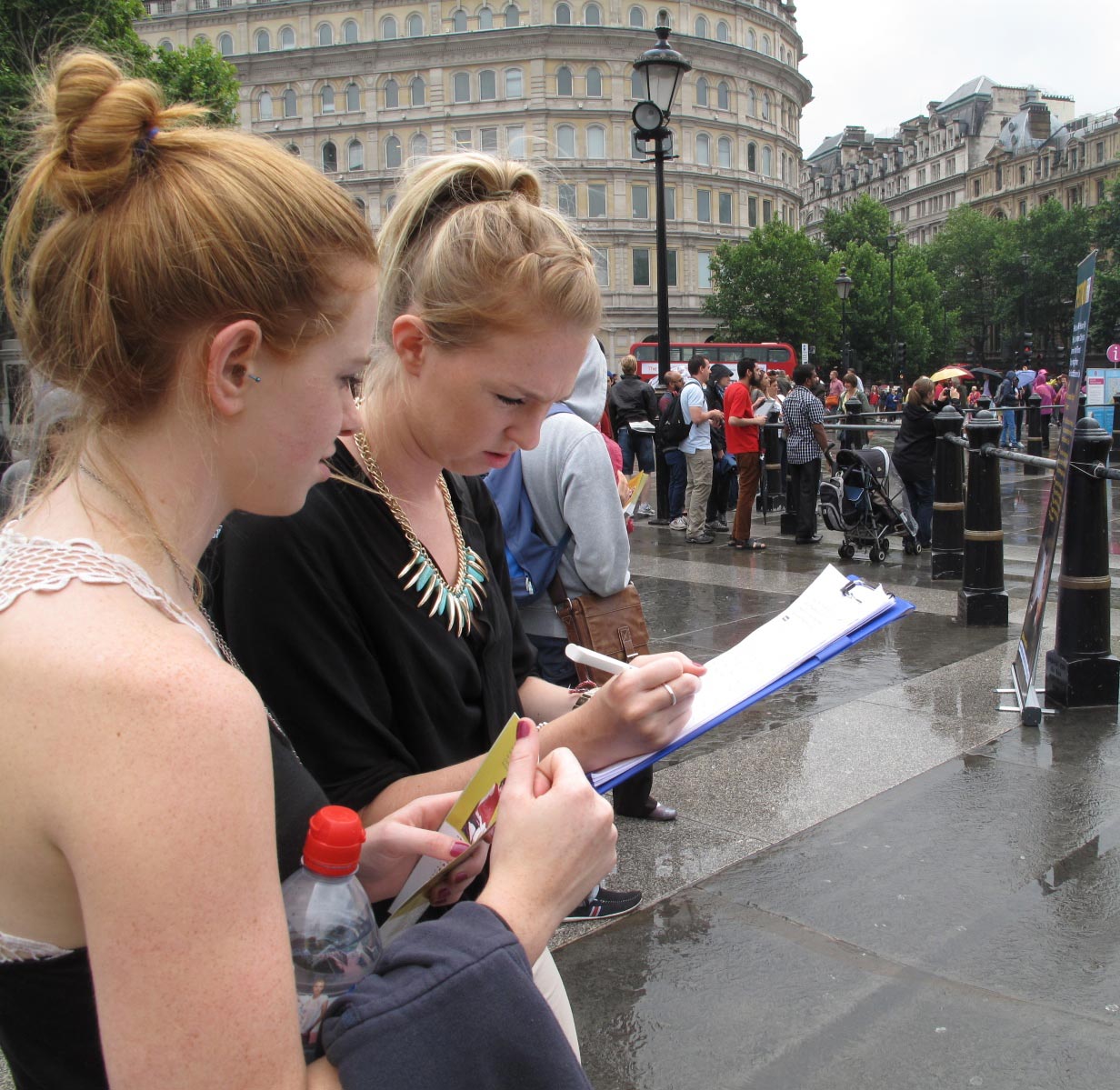 【明慧网二零一三年八月二十七日】(明慧记者唐秀明伦敦采访报道)位于伦敦市中心的特拉法加广场(Trafalgar Square)世界闻名,又称鸽子广场,它是伦敦人、乃至英国人时常举行重大活动的场所,也是来自世界各地的游客不愿放过的著名旅游景点。二零一三年八月二十四日下午,英国法轮功学员来到鸽子广场中心传播真相,并进行“反对中共强摘器官”的征签活动。
