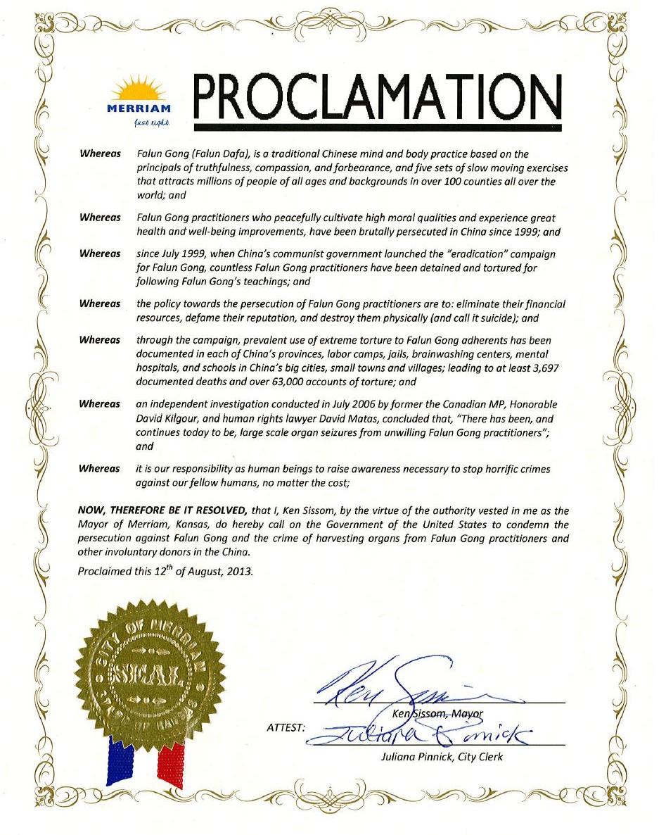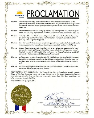 【明慧网二零一三年八月二十七日】二零一三年八月十二日,美国堪萨斯州Merriam市市长签发证书,呼吁美国政府谴责中共对法轮功的迫害,谴责活摘法轮功学员器官和其它非自愿捐助器官的罪行。