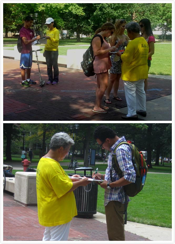 星期四的天气格外晴朗,密西根安娜堡主校园的对角广场(UM DIAG)上人来人往,川流不息。身着黄T恤的法轮功学员们利用此次机会,向人们递上征求“帮助制止中共活摘法轮功学员器官”的签名簿,并向人们讲述法轮功真相。听闻真相的人们被中共活摘器官的罪恶震撼着,纷纷谴责这种反人类的暴行,并签下他们的名字,期盼他们正义的帮助将尽早制止这种暴行。很多学生及家长,在了解到真相后,都纷纷主动在征签板上留下了自己的姓名,并鼓励、赞扬法轮功学员的正义之举。