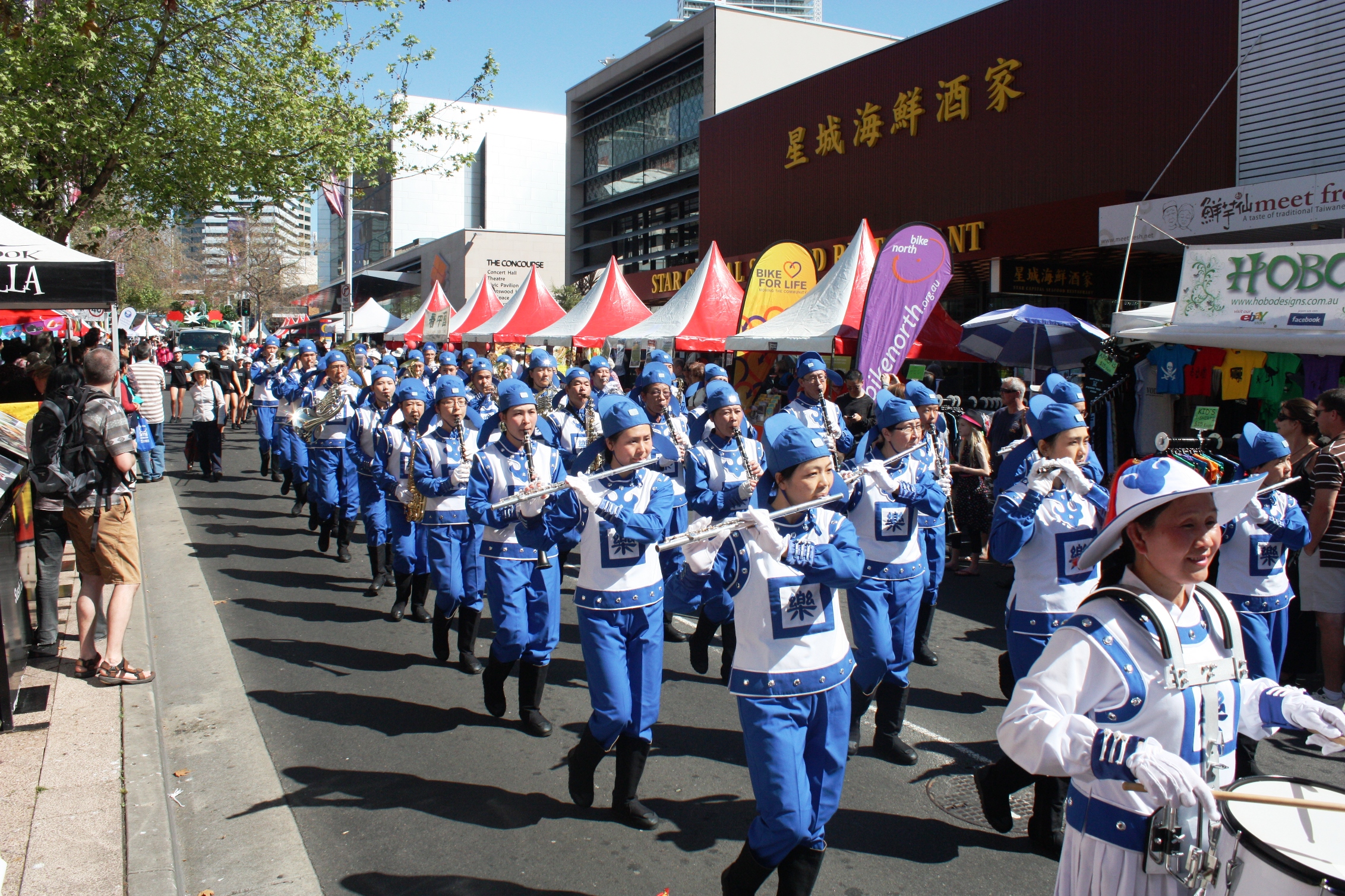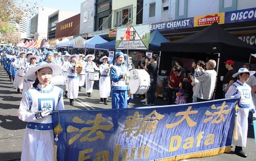 该多元文化节是悉尼北岸最大的文化和娱乐庆典活动,包括游行和街头派对,有来自各族裔民众参加。在众多的游行队伍中,法轮功团队格外耀眼,法轮大法“天国乐团”的队员们身着蓝白色古装,步伐矫健,精神抖擞,阵容整齐。他们演奏了“法轮大法好”、“法鼓法号震十方”、“法正乾坤”、“佛恩圣乐”和“送宝” 等乐曲,鼓乐声中的每个音符都打动着人们的心灵。人们和着乐曲鼓掌、欢呼、雀跃。