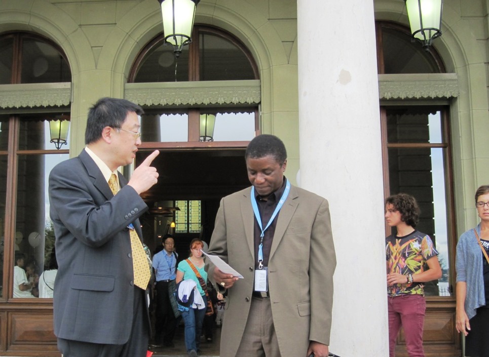 研讨会开始前,法轮功学员陈师众博士代表来到主席台前向佩蕾女士致意,并简要陈述了此行希望向联合国反映法轮功学员受迫害的情况,佩蕾女士表示关注,由于她在研讨会开始后就要离开,因此当场交待相关官员与“法轮功人权”接洽。