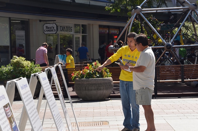 【明慧网二零一三年九月十六日】从八月中旬以来,西雅图法轮功学员已是第二次来到西雅图市中心西湖广场前,展示法轮功五套功法和征集反对活摘法轮功学员器官的签名。他们向当地民众传播真相,揭露中共强制活体摘取法轮功学员器官贩卖谋利的暴行,呼吁各界社会人士共同制止这惨绝人寰的罪行并支持众议院281决议案。